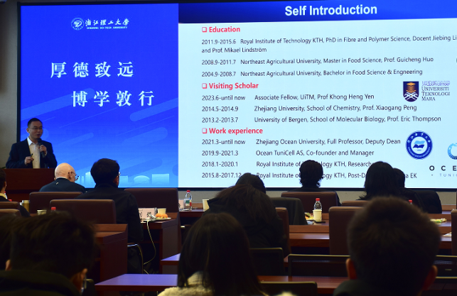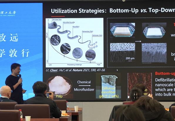 Haq Nawaz教授、中国海洋大学田维乾副教授分别就纤维素纳米纤丝/纤维基低密度材料、木材与生物高分子功能材料、细菌纳米纤维素组装为湿度响应性超强纤维、基于绿色溶剂的木质纤维生物质精炼、多用途纤维素基功能材料、木质纤维生物质重构与增值应用、纳米纤维素/MXene基强韧薄膜的自组装及离电应用等关键专题,带来了内容丰富、兼具深度与前瞻性的学术报告。报告过程中,专家们不仅展示了各自团队的最新科研成果,还针对技术瓶颈、应用前景等问题与西湖大学、浙江农林大学、浙江科技大学等高校学者展开热烈交流,为领域内技术难题的攻克和创新路径的探索提供了多元思路。